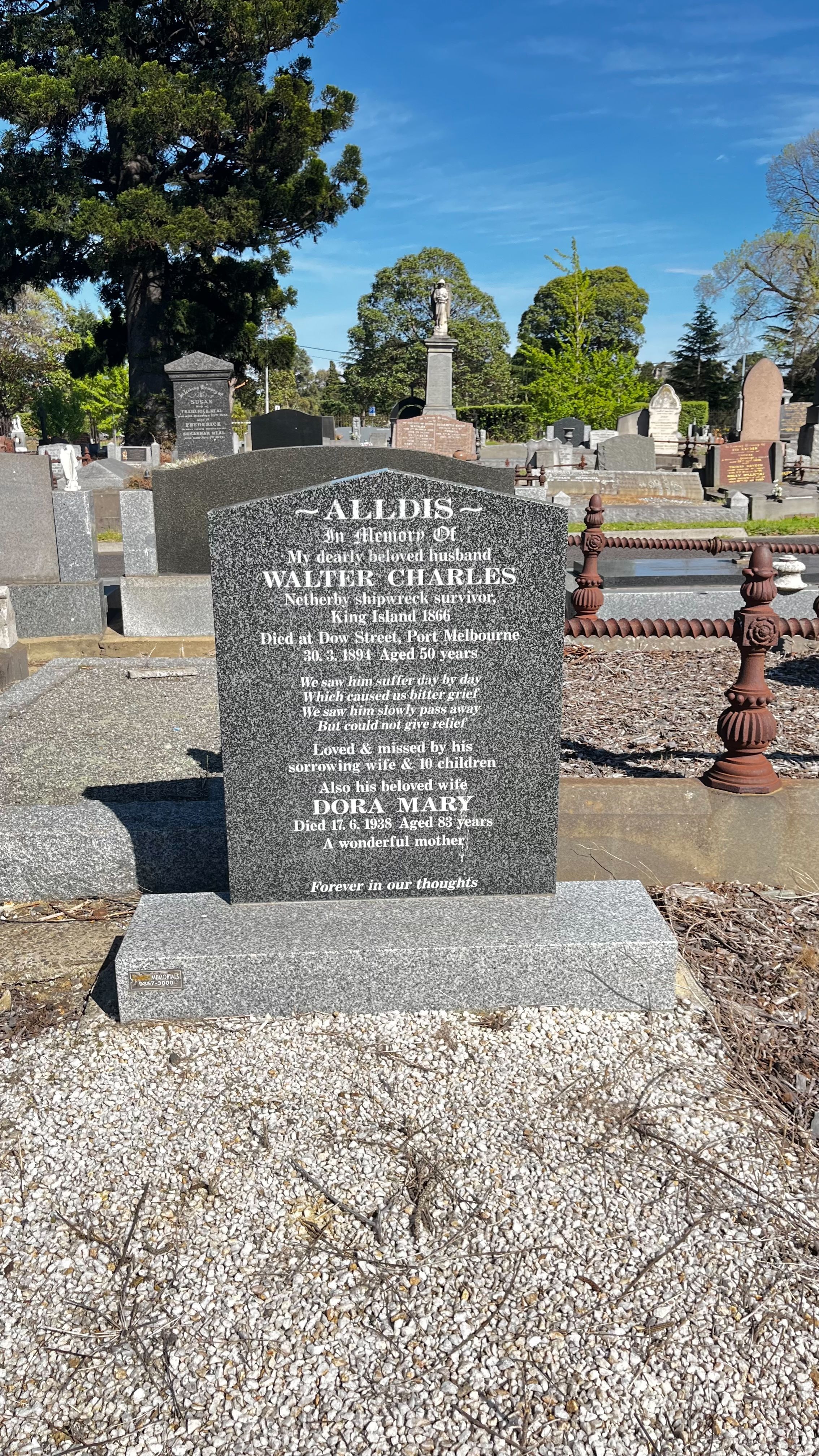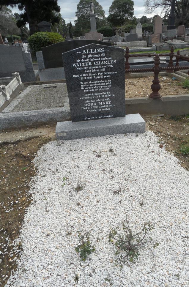 His youngest child William Pope Alldis was killed during the Battle of Passchendaele in June 1917 and is commemorated on the Menin Gate in Ypres. Continuing the theme of wartime misfortune, and tragically ironic bearing in mind that Walter survived a shipwreck, one of his grandsons, William Thomas Alldis Moran, died in April 1942 when the ship he was commanding, HMAS Vampire, was sunk by Japanese bombers off the coast of Sri Lanka. He was a career officer in the Royal Australian Navy, reaching the rank of Commander and twice mentioned in despatches. He is commemorated on the Plymouth Naval Memorial here in the UK.